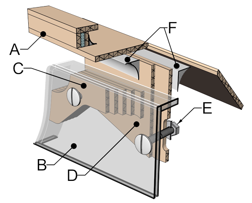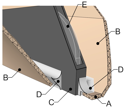 A l’extérieur, un tissu de verre (D) est appliqué, une tresse Kevlar (E) protège les angles les plus exposés. Les surfaces sont glacées pour une finition vernie et enduites pour une finition peinte.