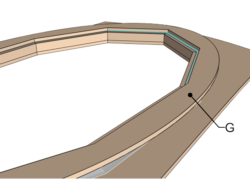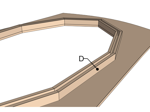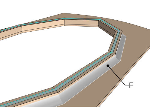 Étape 3Le joint-congé époxy (D) est possé sur toute la longueur et ensuite recouvert mouillé sur mouillé par un ruban de verre (E).