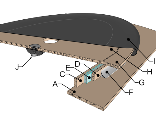 Sur le pont (A) du kayak JULOT des hiloires (C et D) sont collées. Le chapeau de support (H) est ensuite collé par dessus pour créer une lèvre.